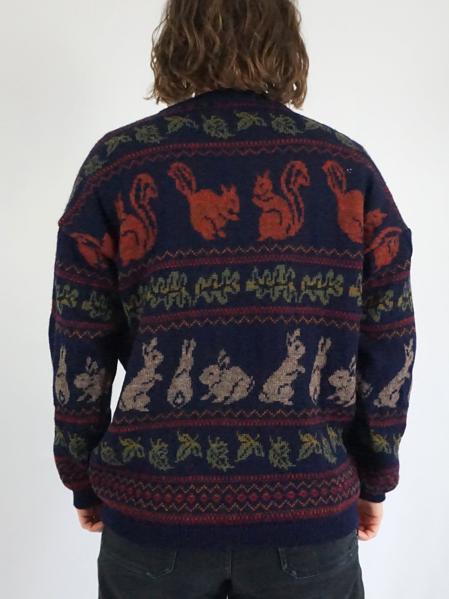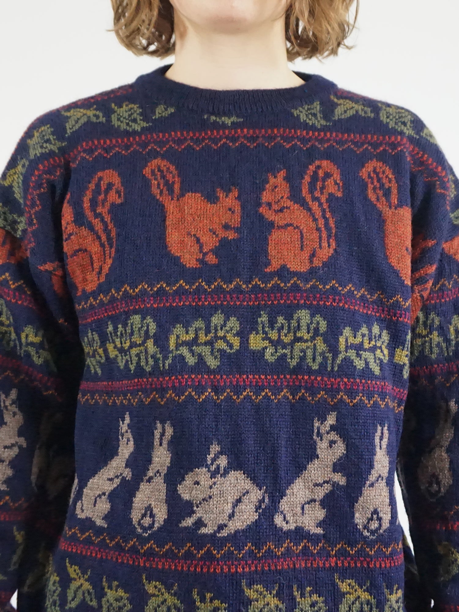 Vintage 90s Tulchan navy blue wool jumper with squirrel, rabbit and leaf patterning.